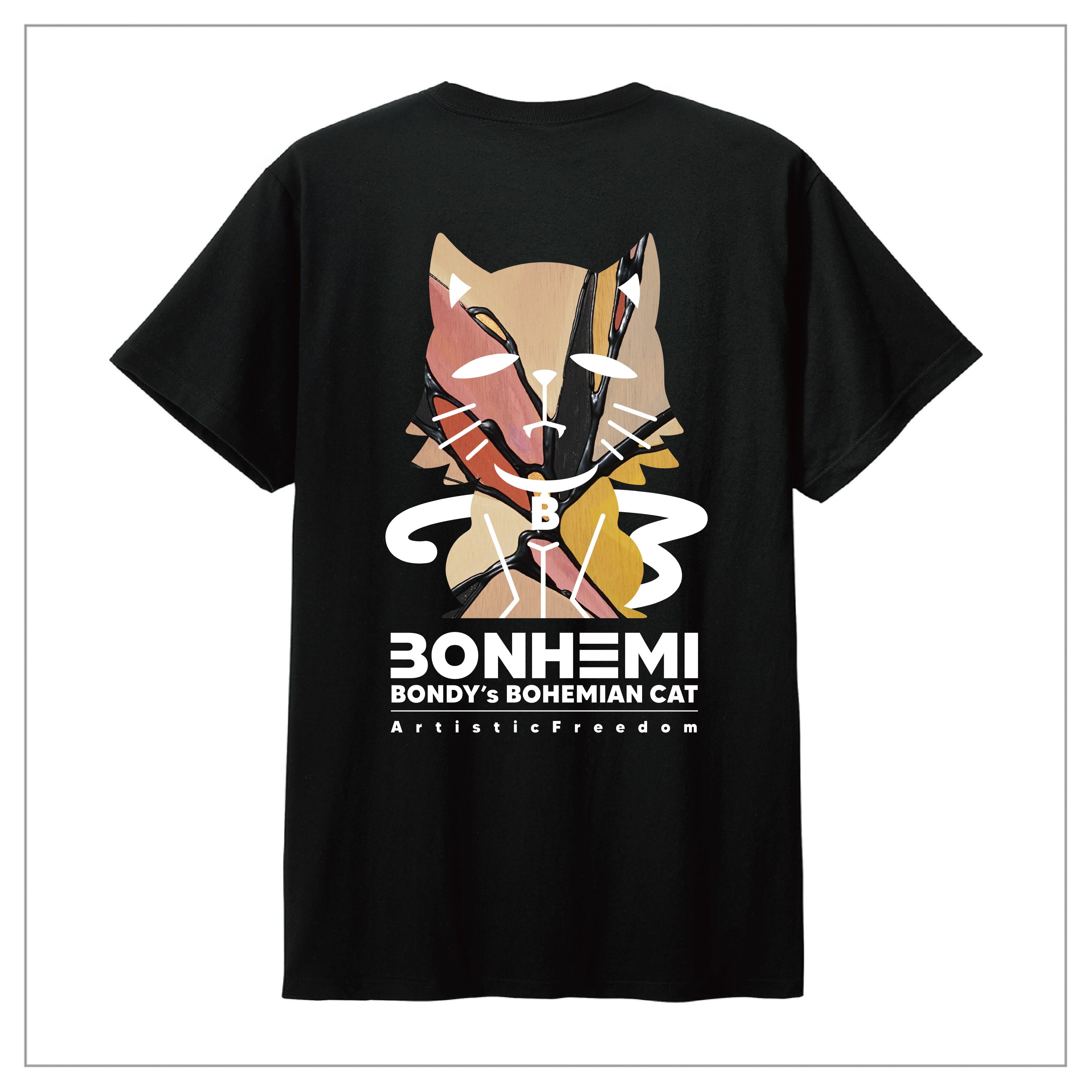 ボンドで絵を描く現代アーティスト「冨永ボンド」がデザインしたオリジナルキャラクター「BONHEMI(ボンヘミ/BONDY's BOHEMIAN CAT)」を背面に大きくプリントしたプレミアムインクジェット印刷Tシャツです。