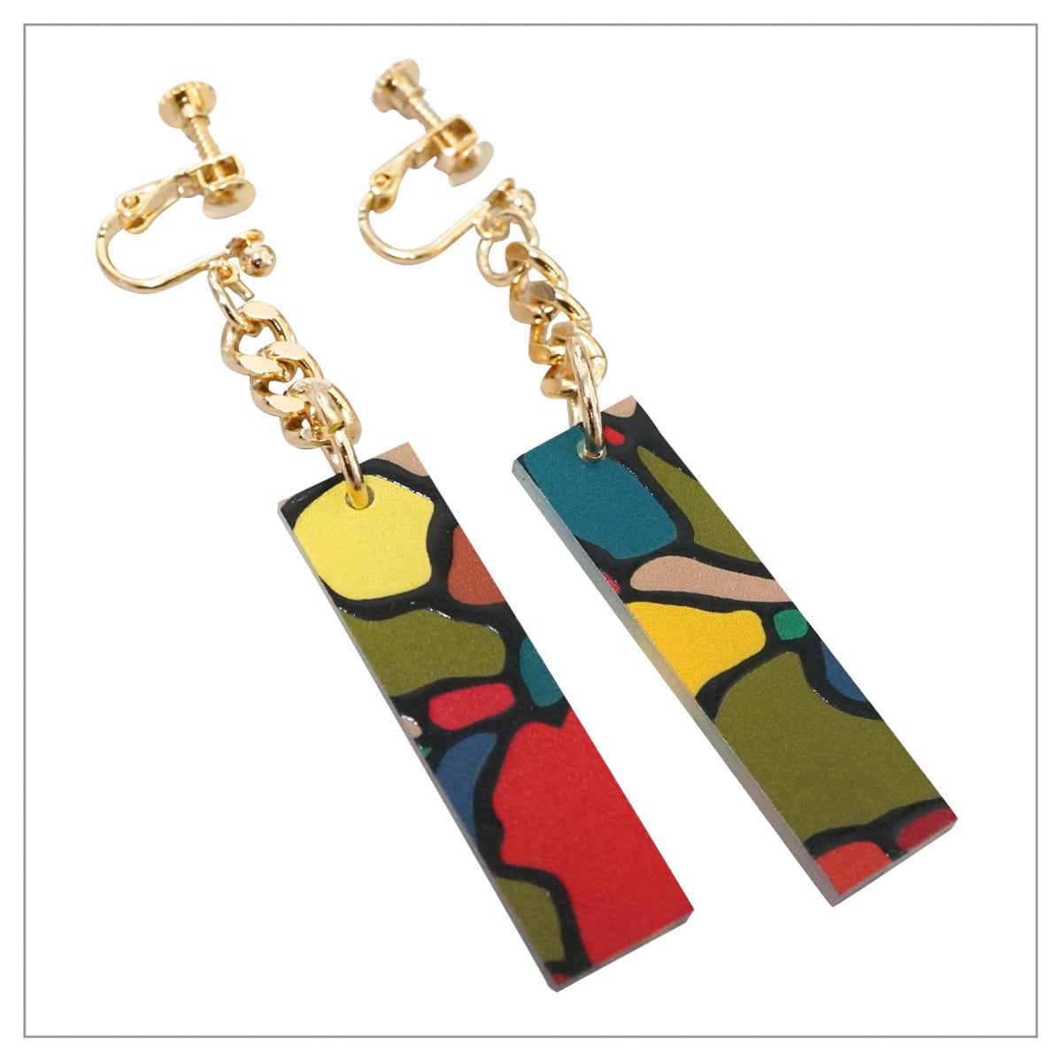 原画の絵肌を再現した「立体印刷仕様のアクリルプレート」と、三連ゴールドチェーンパーツを組み合わせたオリジナルイヤリングです。